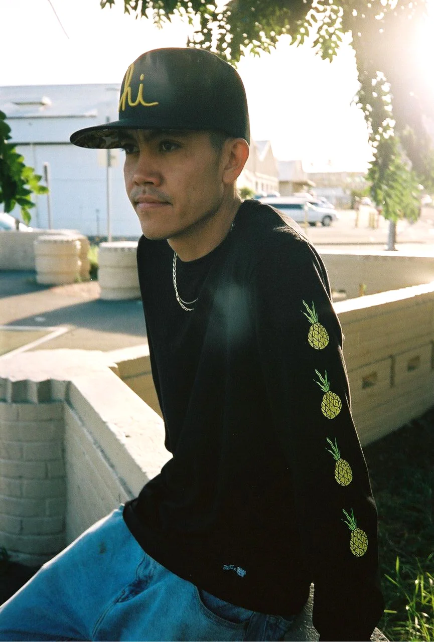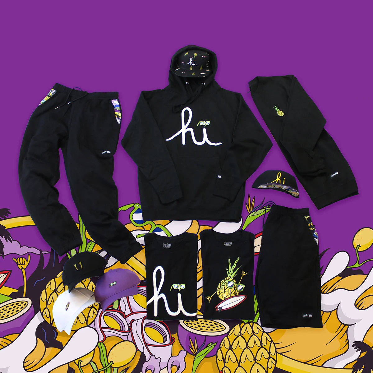Inspired by Brisk's Pineapple Passionfruit Iced Tea label designed by artist Aaron Kai, the line is fashionable and a lot of fun. The co-branded line includes an assortment of long and short-sleeve tees, sweat shorts, sweat pants, a signature hoodie, and several different headwear styles, all featuring a California pop-art aesthetic and a mashup of iconic graphics from each of the brands.